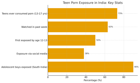 Recent studies reveal that over 73% of Indian teenagers (13–17 years) have consumed pornography, many before the age of 13. A significant 38% report encountering explicit content through social media like Instagram. The data shows how exposure is not rare or accidental anymore — it’s widespread, early, and deeply tied to digital habits.